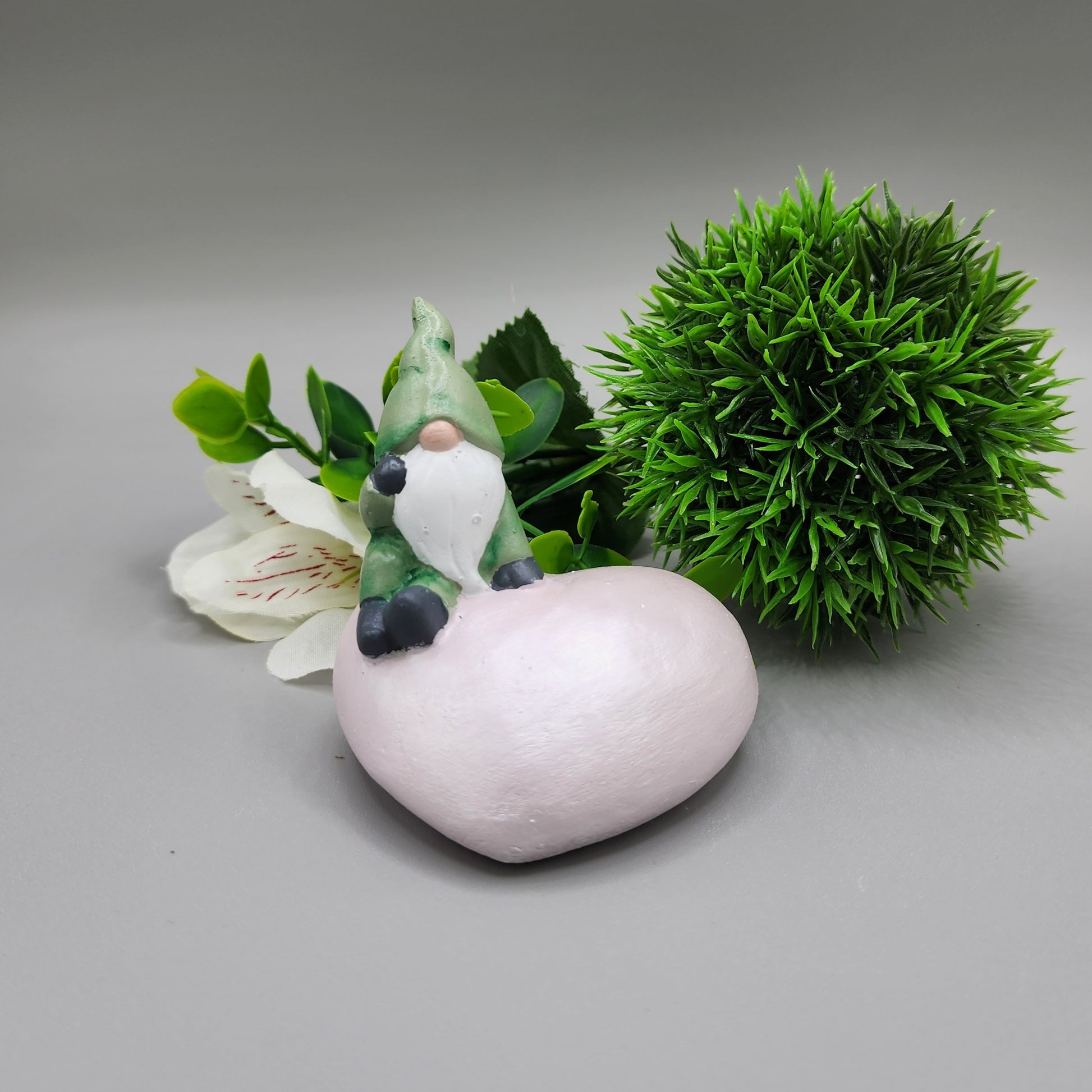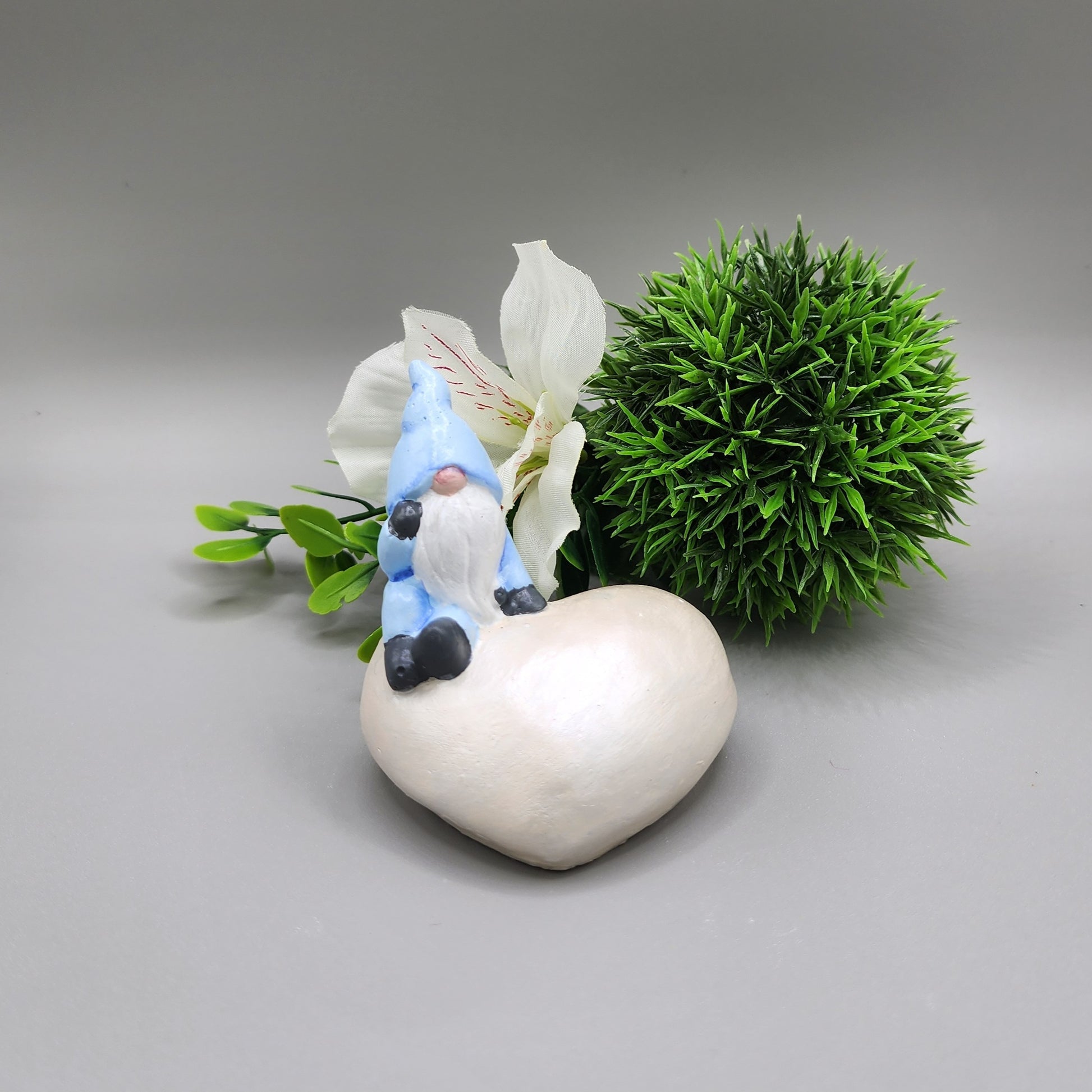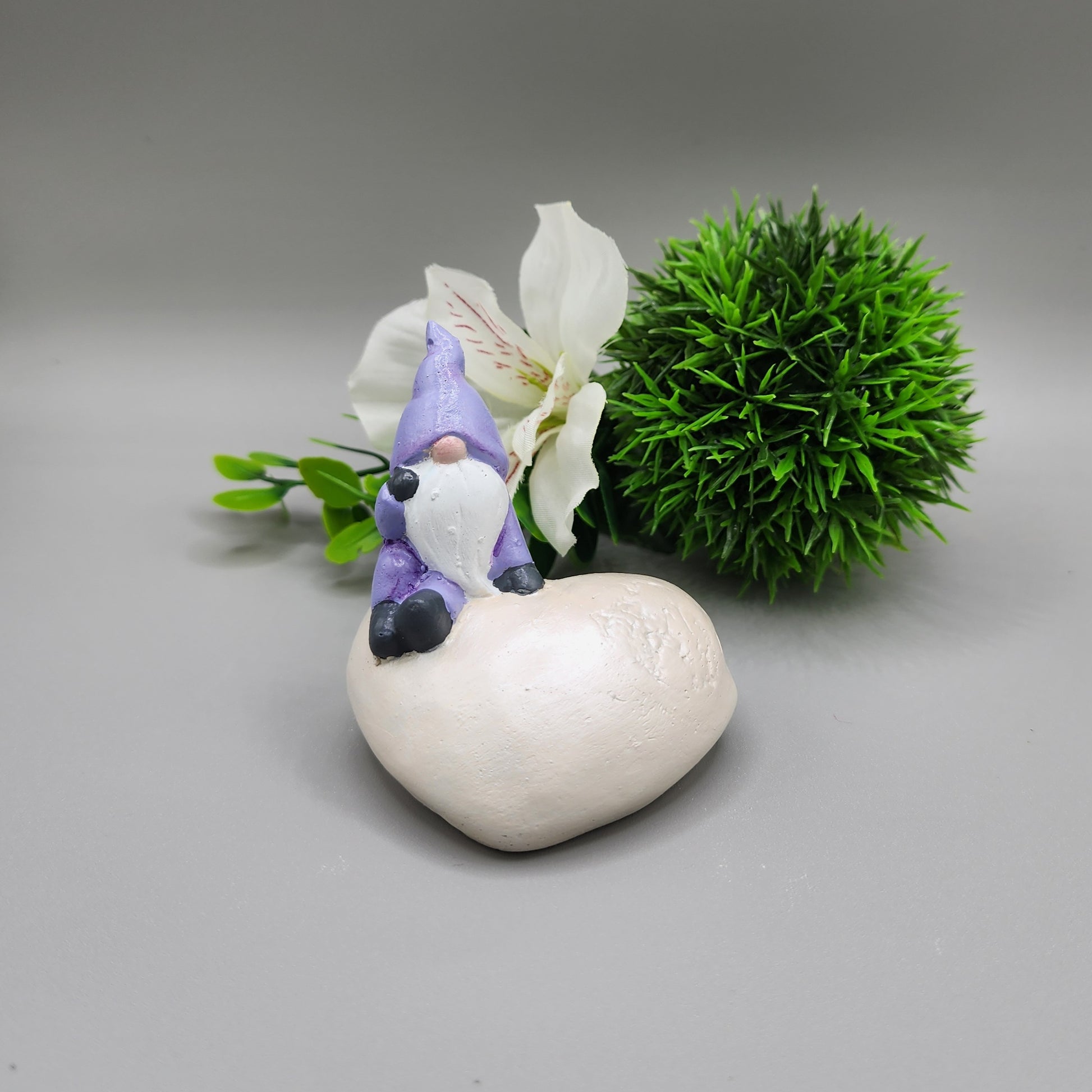 This gnome is named Aspen. This little thinker gnome is sitting a heart shaped stone and would look perfect sitting on a shelf or desk.