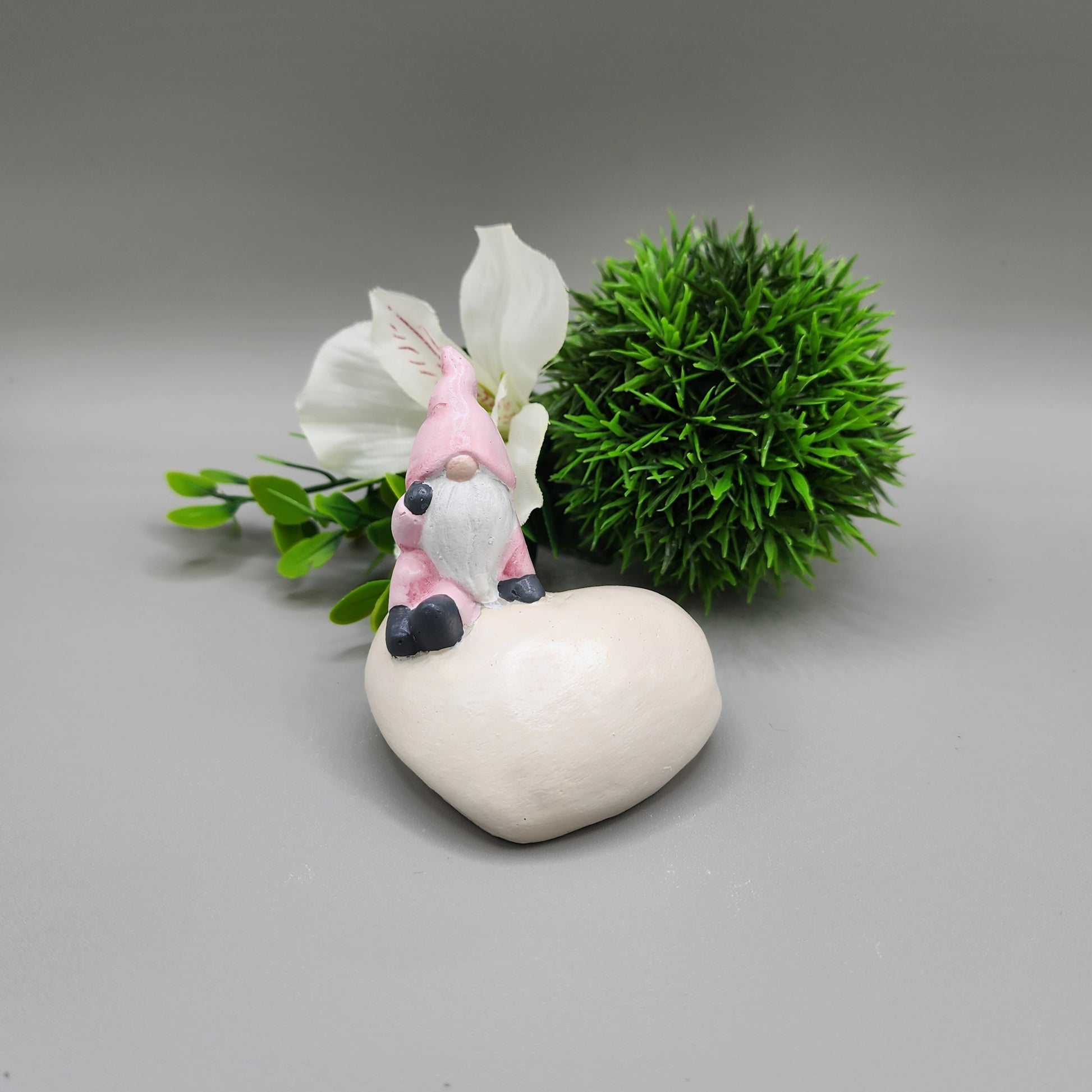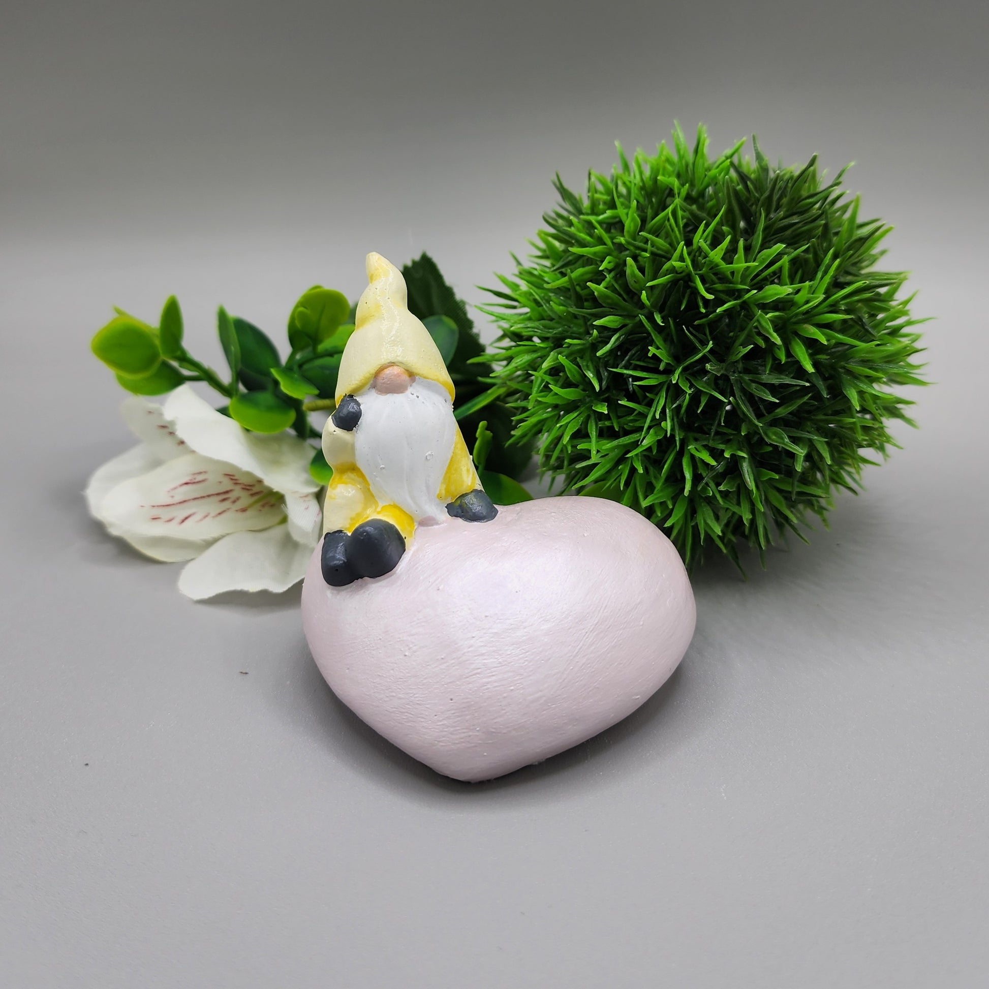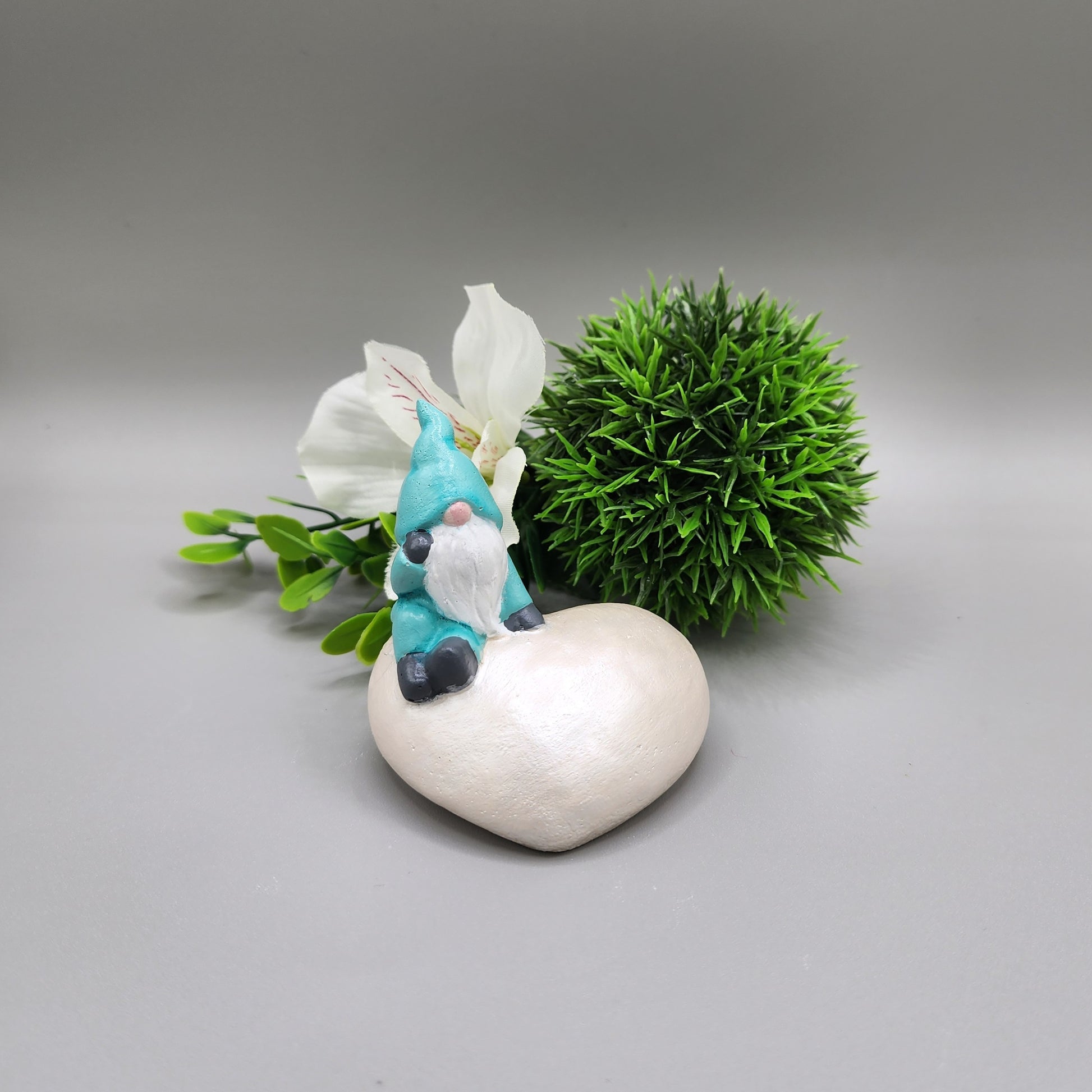This gnome is named Aspen. This little thinker gnome is sitting a heart shaped stone and would look perfect sitting on a shelf or desk.