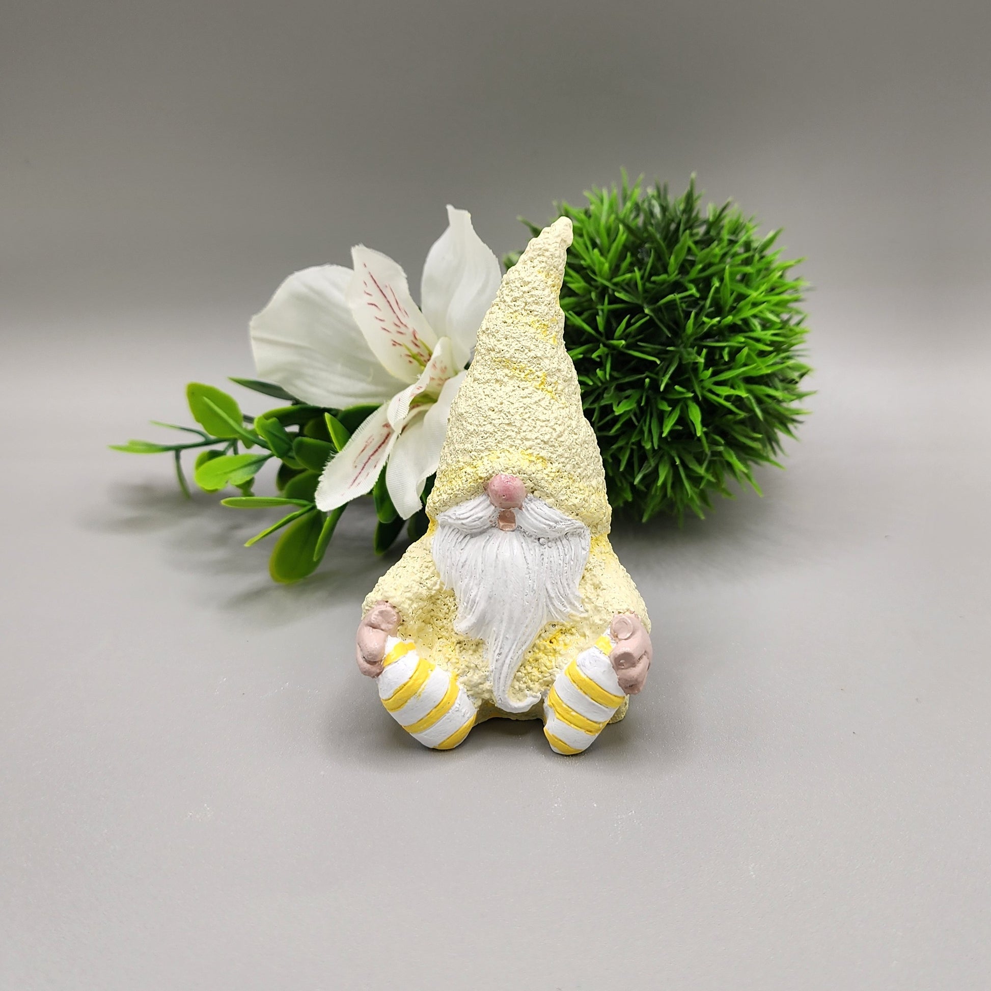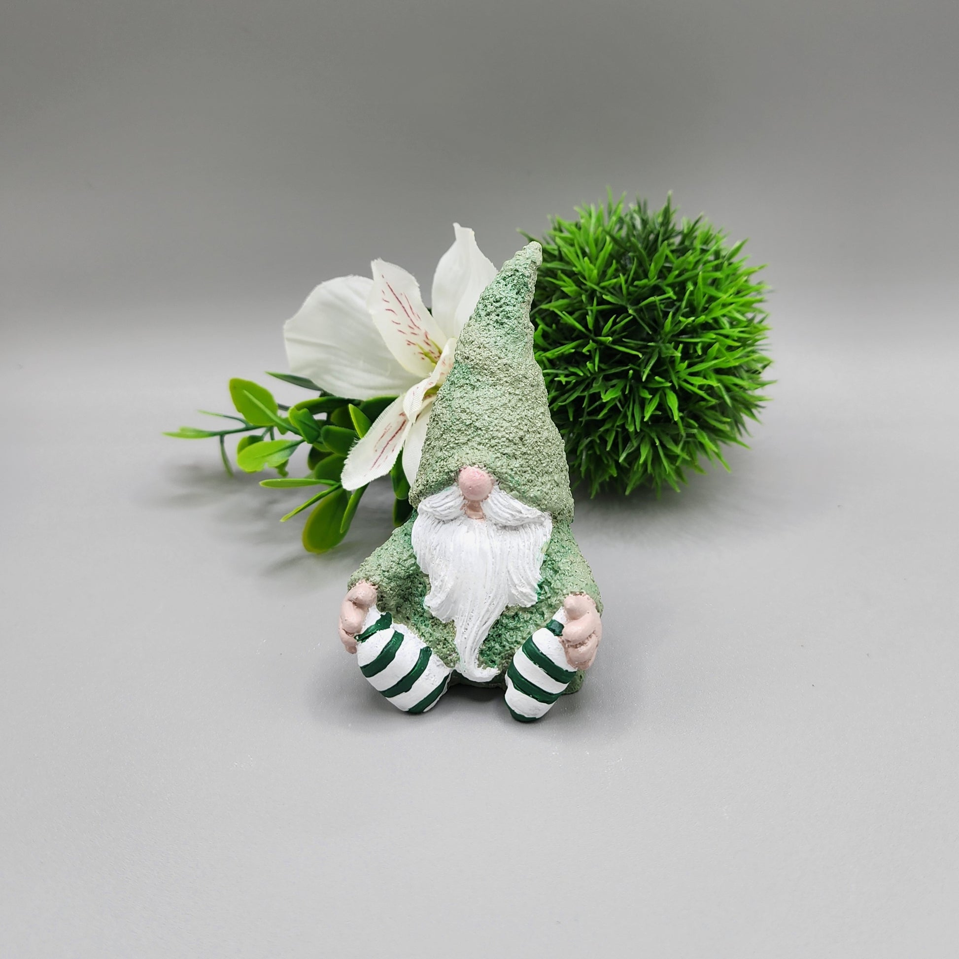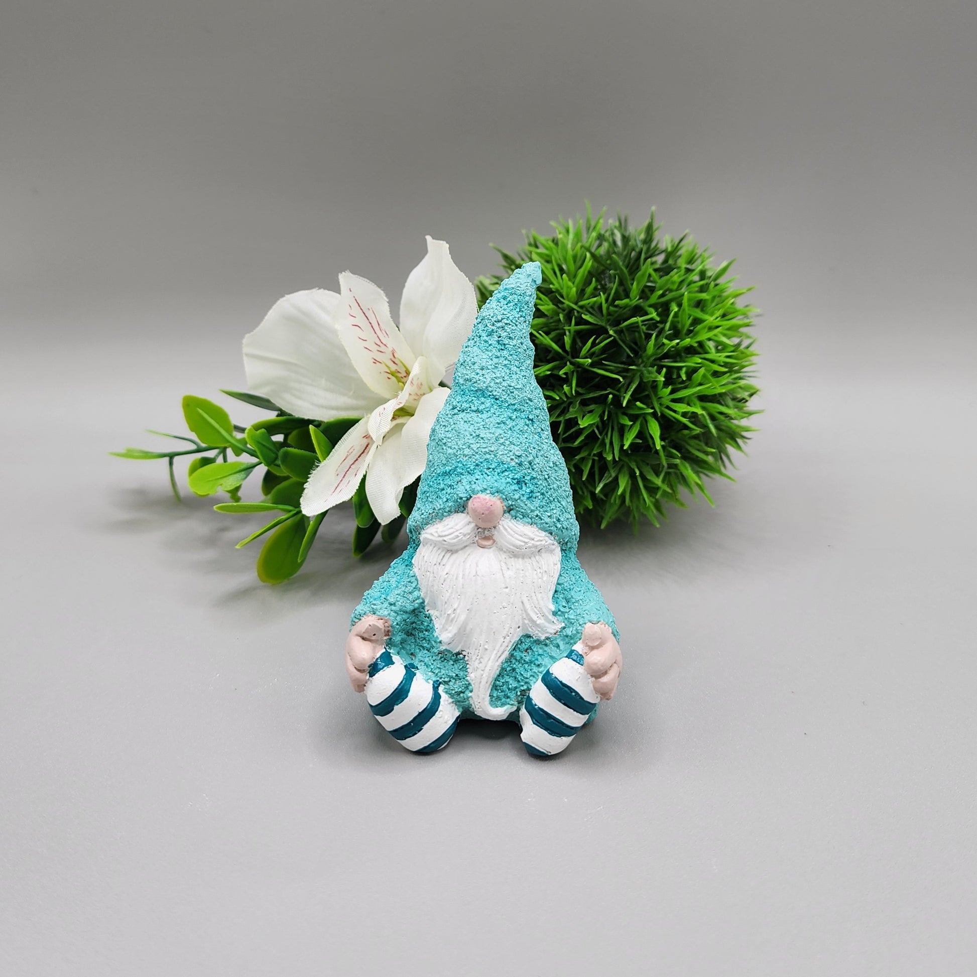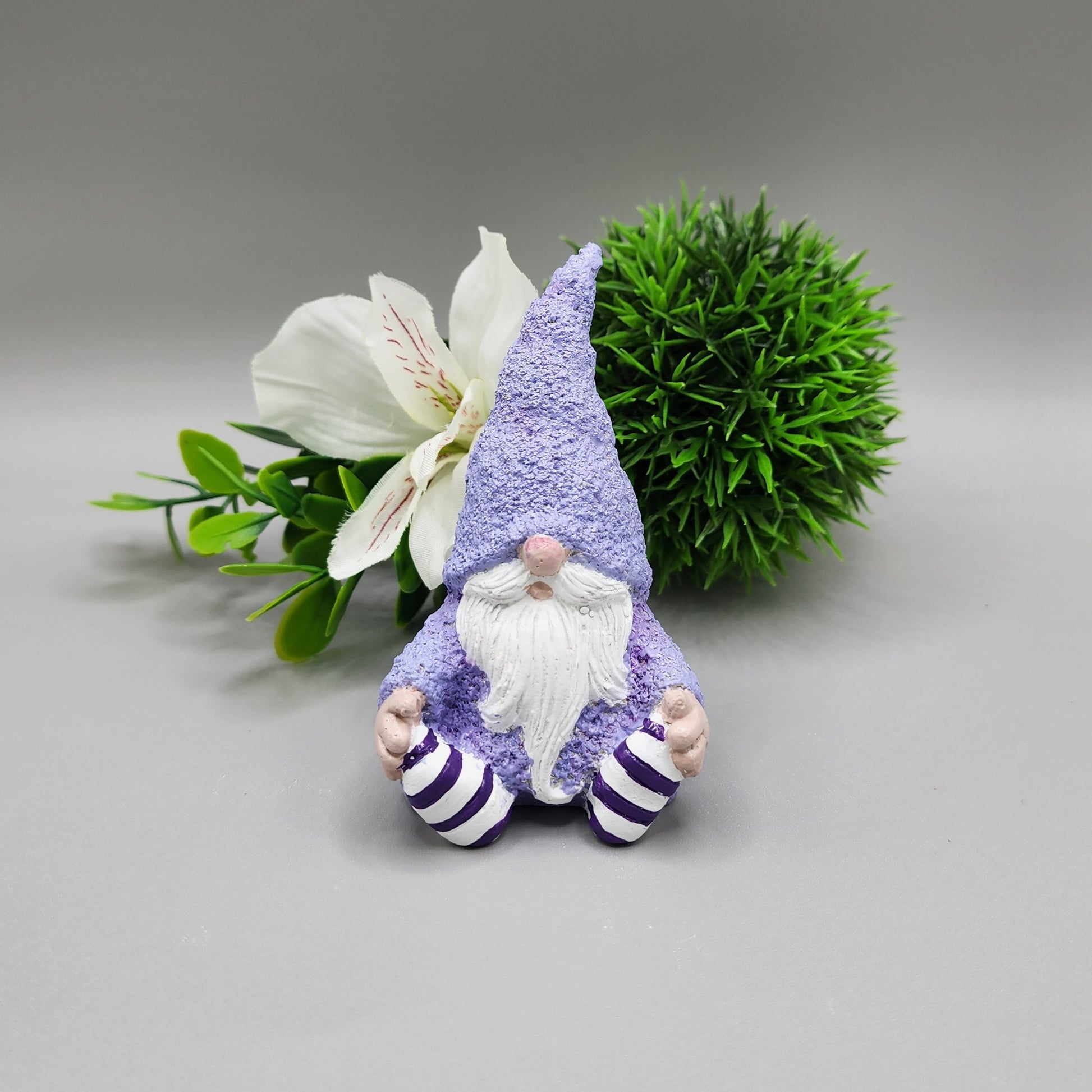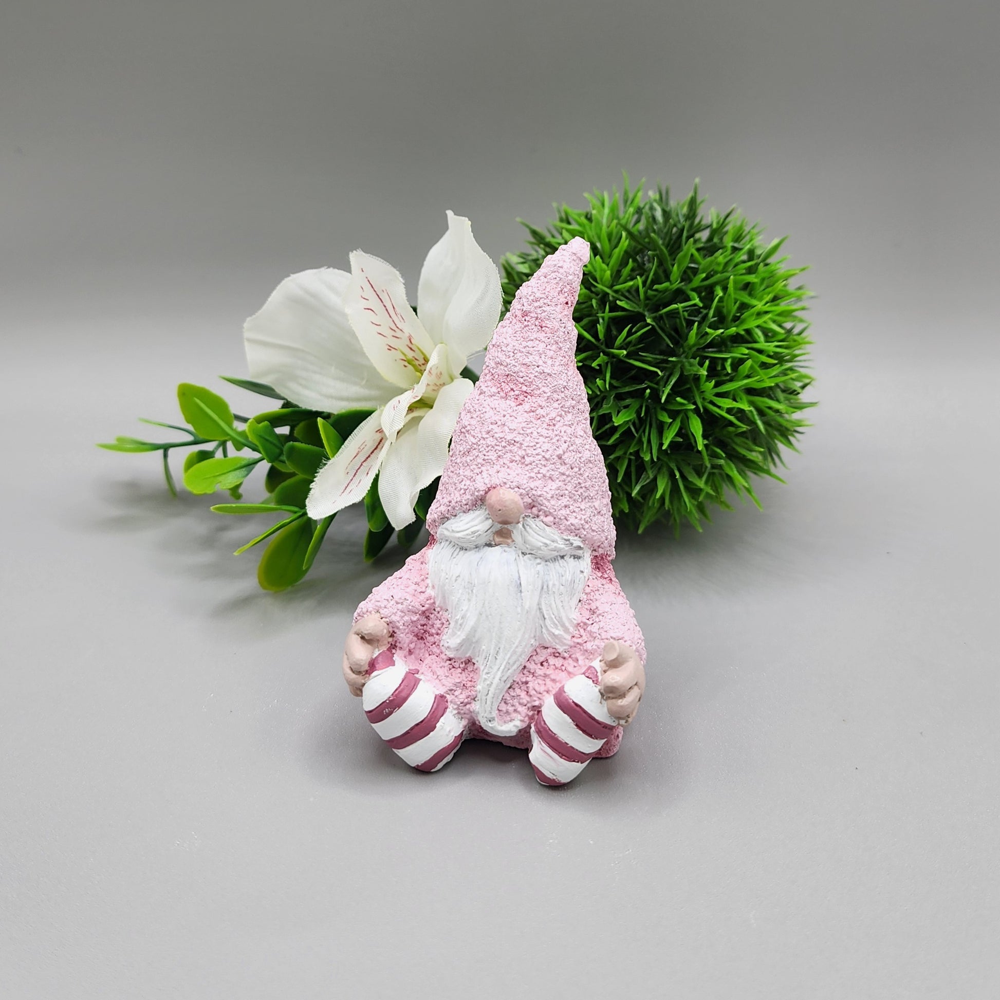 This gnome is named Cedar. Cedar is wearing a cozy fuzzy suit and matching striped socks. Cedar would be a wonderful addition to a tray and used as a ring holder or to sit on a table or shelf. Cedar has the cutest pink nose, mouth and hands.