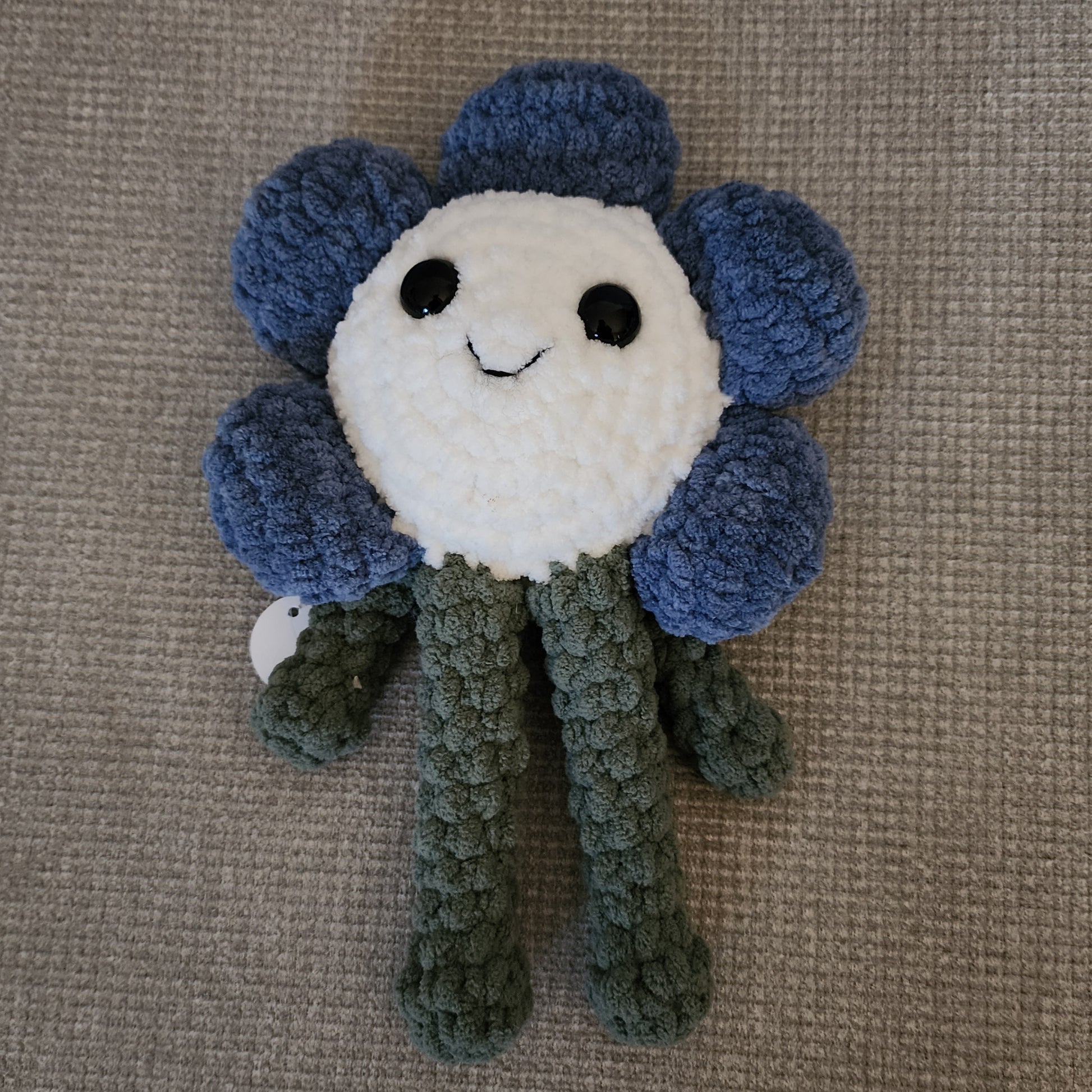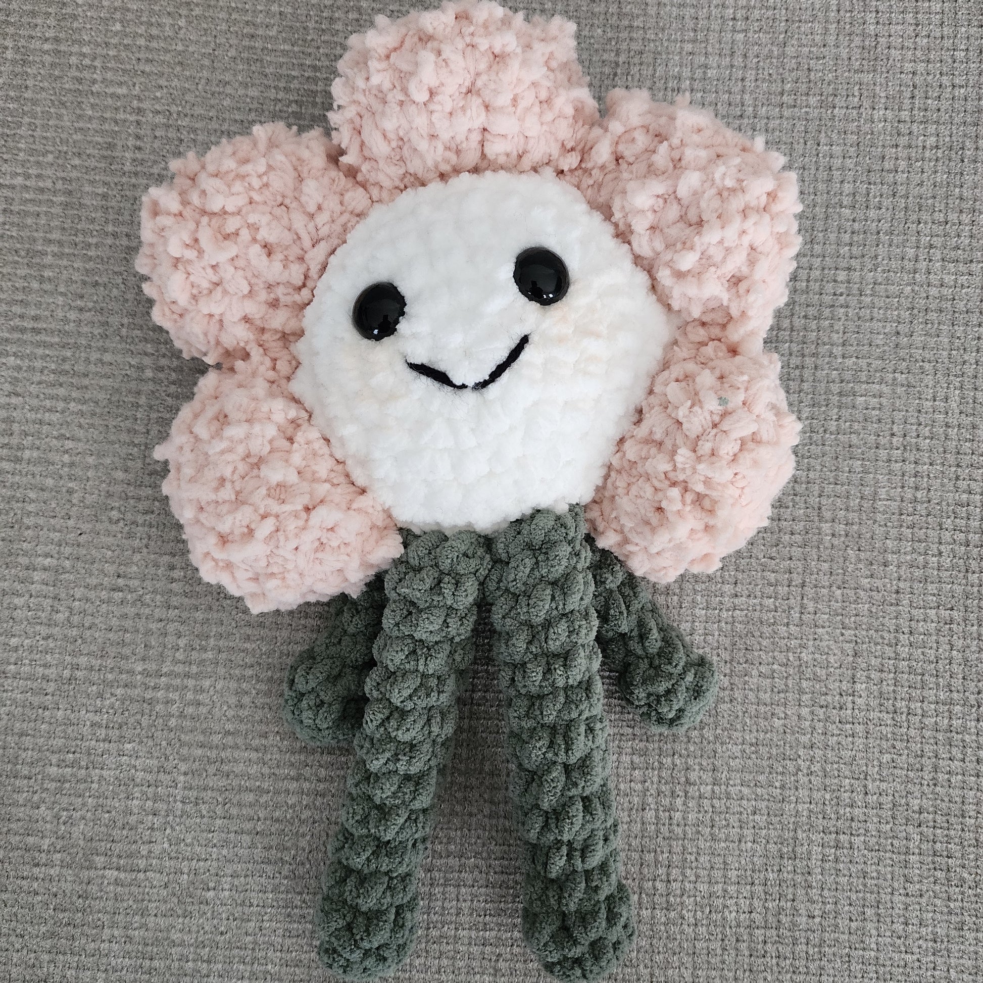 Snuggle up with this adorable crocheted flower snuggler pillow! With it's cheerful smile, wiggly arms and legs, and soft petals, it's the perfect cuddle companion for kids and anyone who love a touch of whimsy. Hand crocheted with love, this unique pillow adds a pop of color and personality to any room.