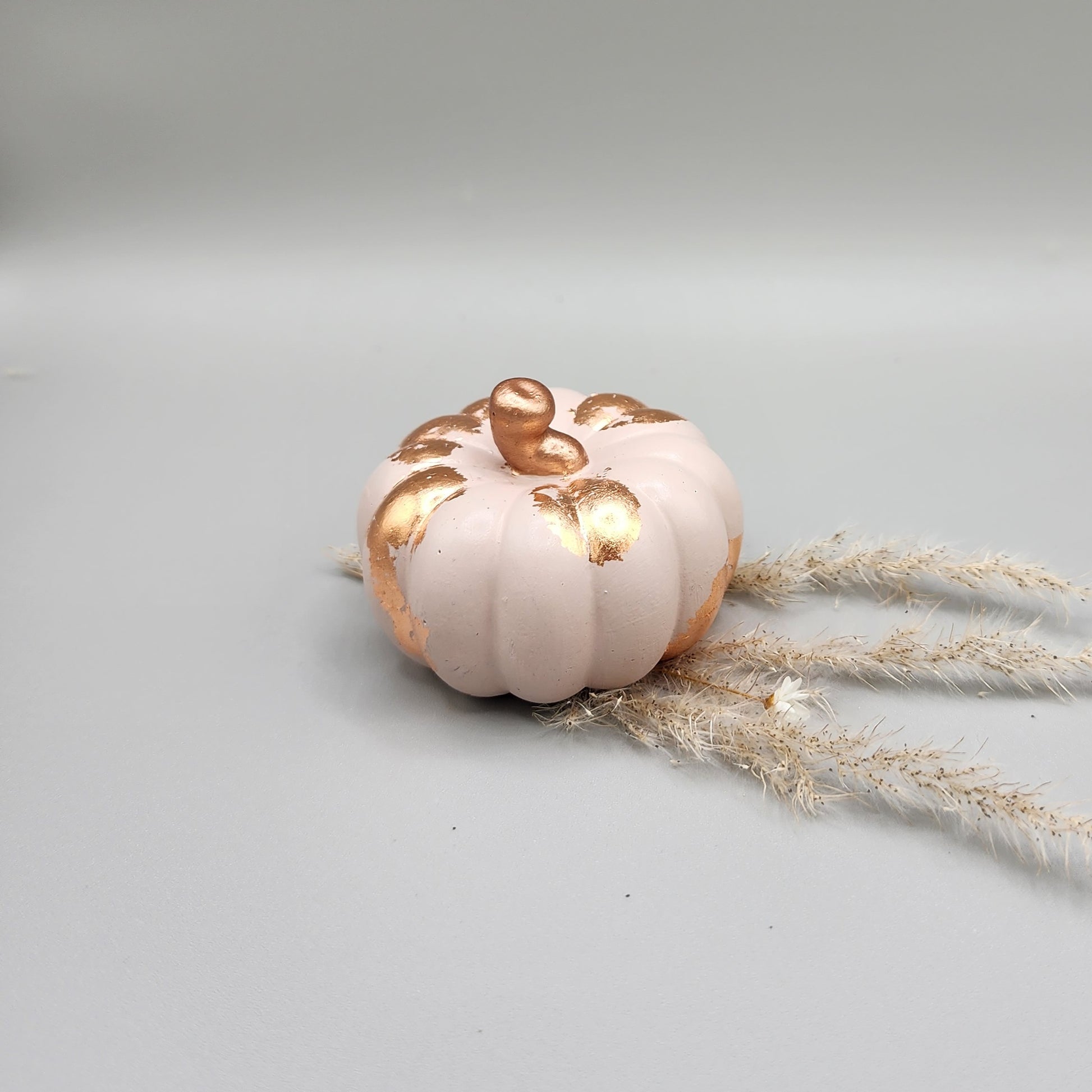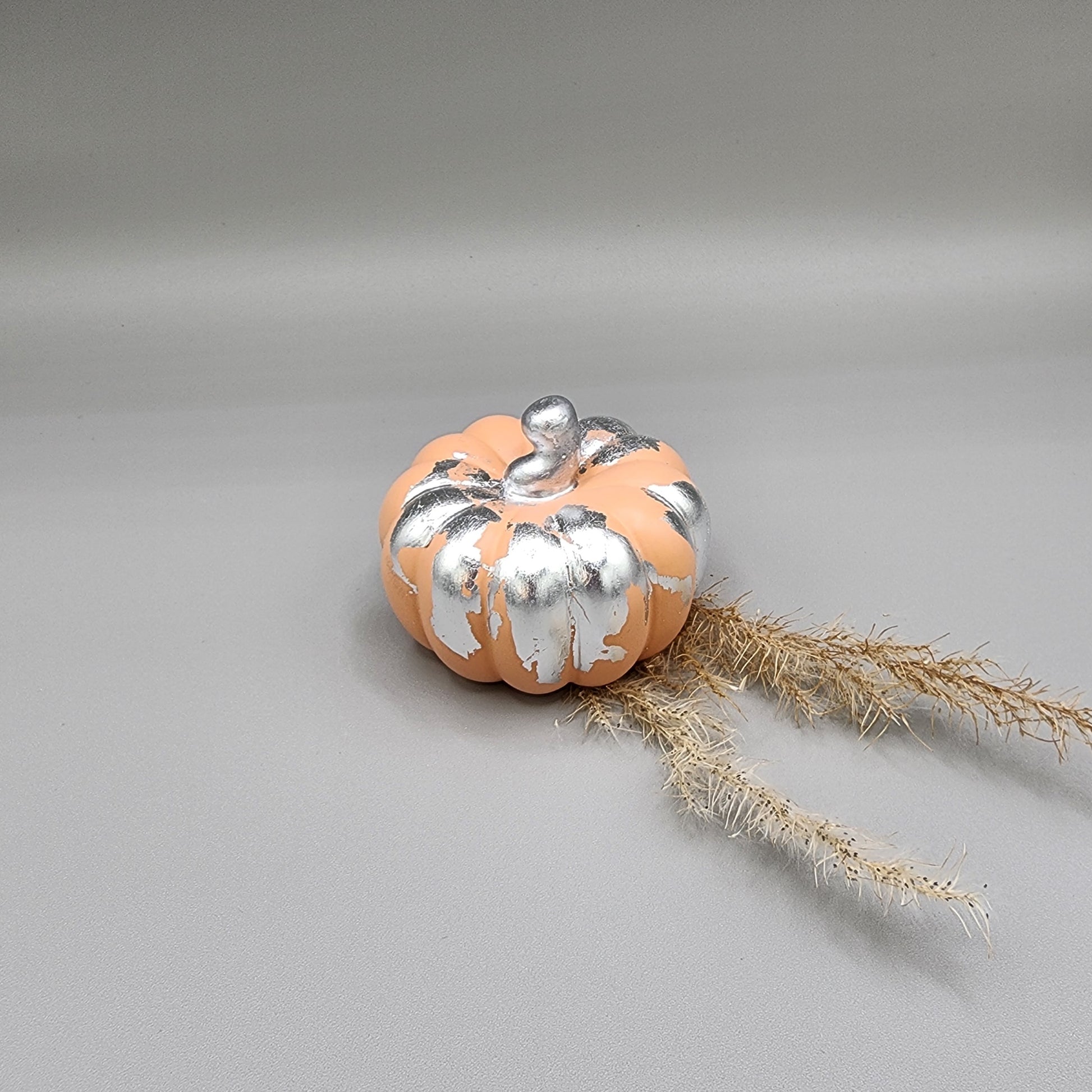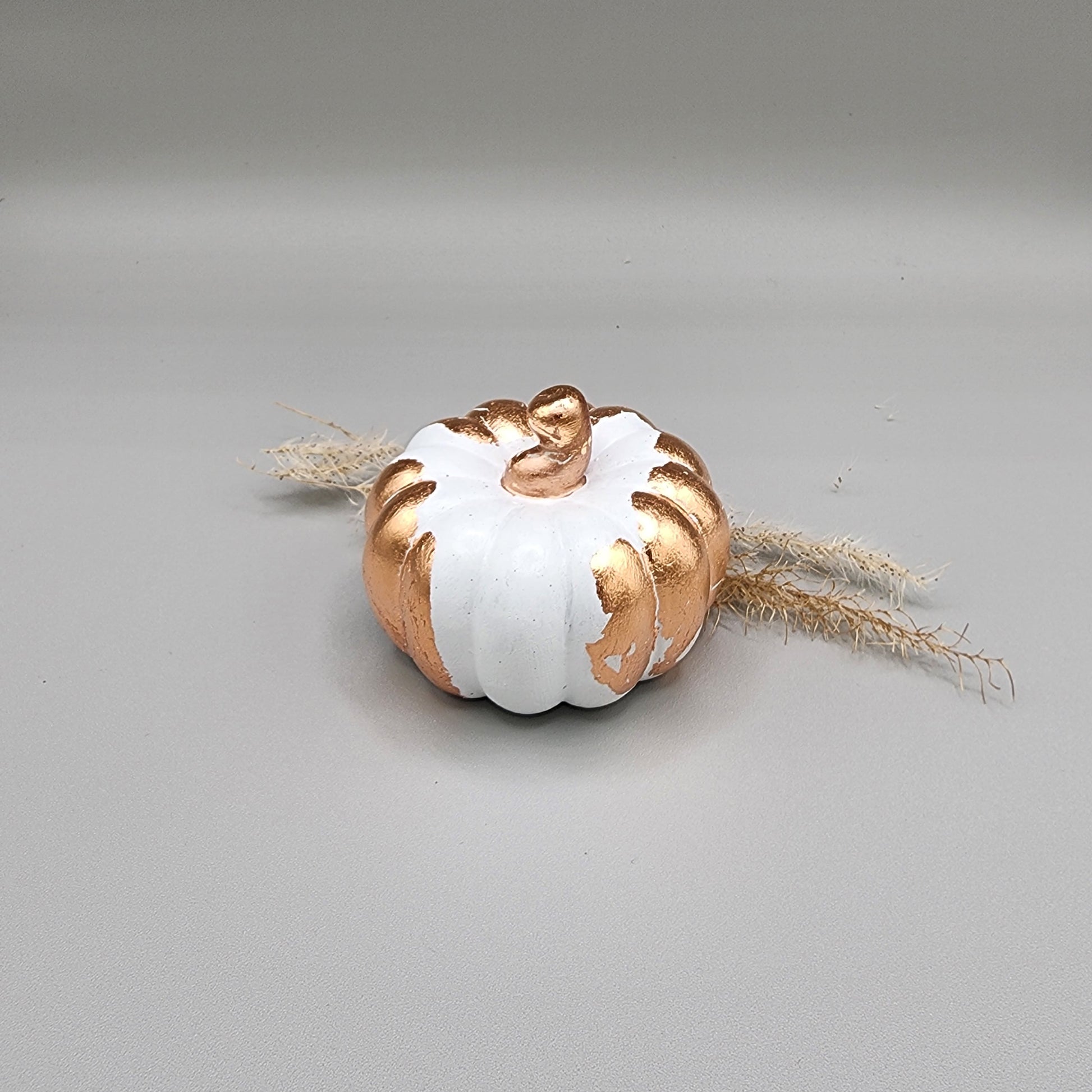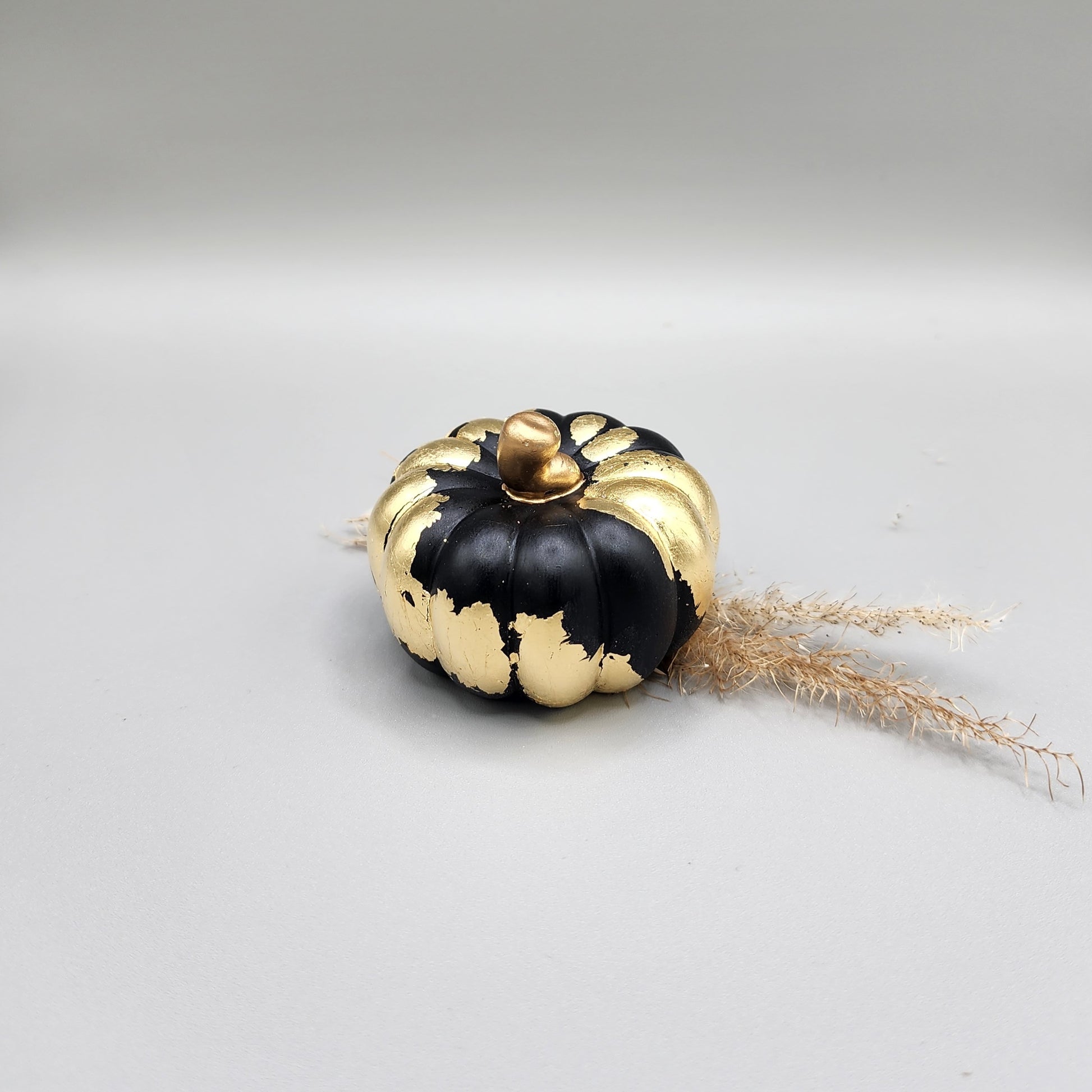 Looking for stylish Autumn decor? These gold leaf pumpkins are perfect to coordinate with the other size pumpkins for a perfect display. They are available in 6 muted vintage colors and black and white with metallic stems and corresponding gold leaf highlights. Each pumpkin is sanded, painted, highlighted and sealed.