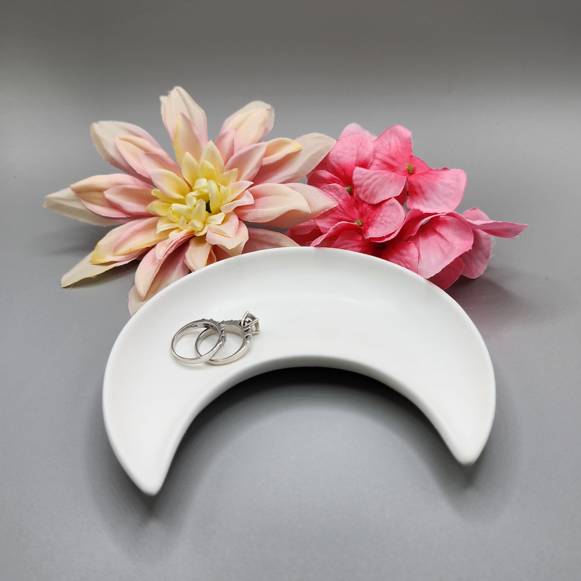 Unleash your inner stargazer with this stunning moon shaped dish. Crafted from smooth, ceramic resin, this beautiful dish is the perfect place for your most cherished possessions. Whether your use it to hold sparkling rings, delicate necklaces, or a collection of crystals, its celestial design beings a touch of cosmic wonder to any space.