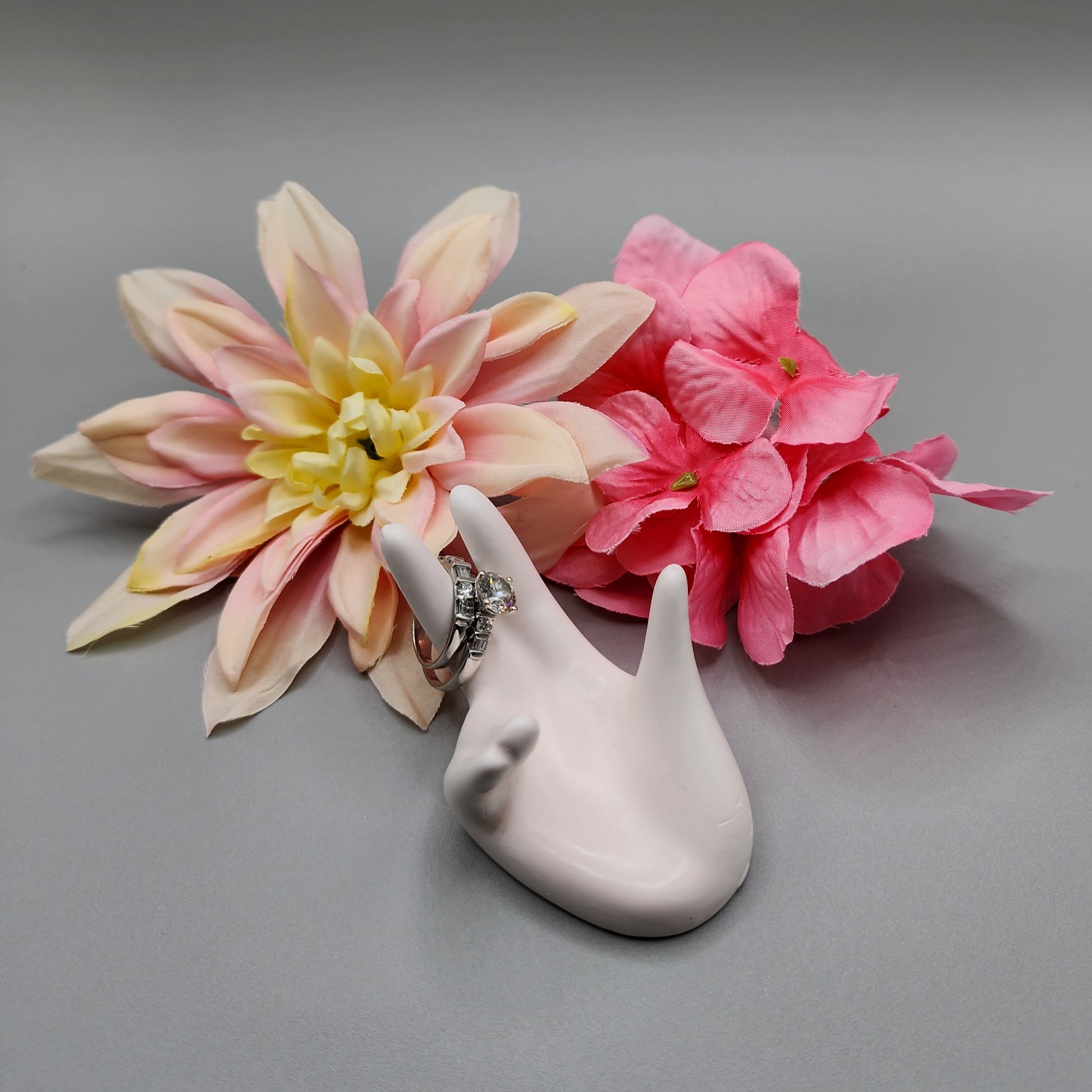 Made from smooth ceramic resin this sculptural piece features a outstretched hand with slender, graceful fingers designed to hold multiple rings. Perfect for everyday rings or special occasion pieces, this hand ring holder is a thoughtful gift for any jewelry lover.